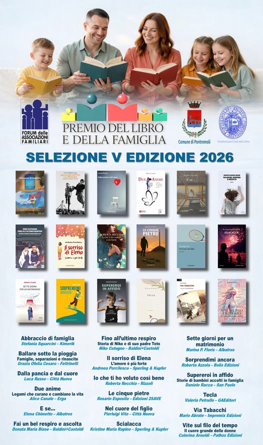 Il Forum delle Associazioni Familiari, in collaborazione con il Comune di Pontremoli e la Fondazione Città del Libro, annuncia la selezione dei diciotto testi che hanno superato la prima fase della V edizione del Premio Letterario “Pontremoli – Città del Libro e della Famiglia”, la cui cerimonia finale si terrà il 4 luglio 2026 a Pontremoli.